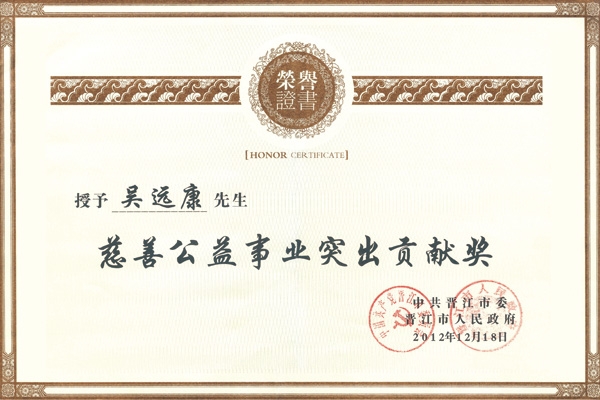三遠(yuǎn)集團董事長、總裁吳遠(yuǎn)康先生榮獲晉江市捐贈公益事業(yè)突出貢獻獎