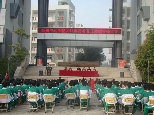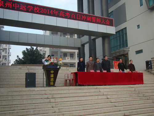 2月26日下午,泉州中遠學校2014屆高三年級舉行了高考百日誓師動員大會。校領導及高三全體師生共同見證了這一令人振奮的時刻! 王芳玉老師代表高三全體教師鄭重宣誓:“我們將精誠團結,言傳身教,愛生如子;我們將刻苦鉆研,精心備課,完善教學方法;我們將隨時關注高考動態,采集最新高考信息,及時調整應考策略。” 接著,高三文科班、理科班學生代表分別上臺表達了信心和決心。他們的誓詞似春雷,似戰鼓,精神奮發,豪情萬丈。他們表示,“學校領導的關懷是對我們前程與未來的美好祝愿,老師們的耐心是鼓勵我們前進的不竭動力,我們是中遠學子,我們要以刻苦拼搏的精神,以更優異的高考成績譜寫母校的榮光。” 王延興校長勉勵學生志存高遠,銳意進取,堅定信心,準確定位,鎖定目標,科學安排,提高效率;以敏銳的觀察能力,勇敢的探索精神,嚴謹的思維方式,健康的心理素質,永不言敗的壯志豪情來奮戰100天,智取高考這座高山。