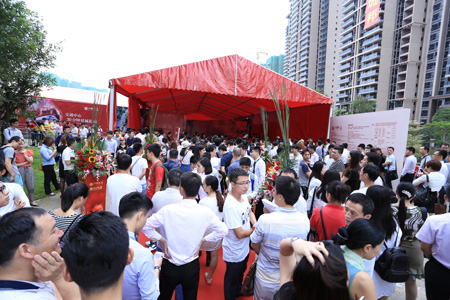 簽到現場客戶情緒高漲,雖遇大雨,但依然無法阻擋絡繹不絕的客戶,客戶等候區早已爆滿,連走道都被圍堵得水泄不通,人氣爆棚全城罕見。在激情昂揚的開場舞之后,開盤儀式正式啟動。隨著主持人宣布搖號正式開始,現場氣氛持續升溫,在場所有客戶都目不轉睛地盯著現場屏幕,生怕錯過自己的簽到號碼,緊張激烈的搶房氛圍充斥著整個銷售現場。