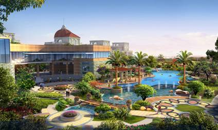 社區主要設計了5大核心景區:入口水景園林、泳池及會所水景園林、休閑庭院、陽光草地、四季水景庭院。在主入口處,規劃了面積較大的入戶水景園林,配以特色噴泉水景、景觀燈柱、水景墻、景觀雕塑小品作為入口廣場美景,以彰顯主入口的勝景氣勢和趣味性。入口水景園林區還設置木平臺、休閑桌椅,為業主們提供一個舒適愜意的休閑地。