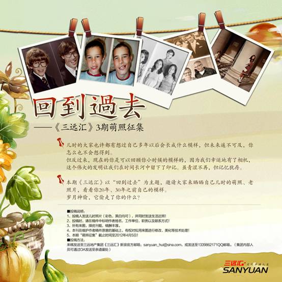 兒時的大家也許都有想過自己多年以后會長成什么模樣,但未來遙不可及,你怎么也不會想得到。 但反過來,現(xiàn)在的你是可以回顧你小時候的模樣的,因為我們幸運地有了相機,這個偉大的發(fā)明讓我們在時間長河中留下了印記。雖青澀不再,但記憶猶存。 本期《三遠匯》以“回到過去”為主題,邀請大家來曬曬自己兒時的萌照、老照片,看看你20年、30年之前自己的模樣。 歲月神偷,它偷走了你的什么? 投稿說明:1、每人應提供不少于2張的兒時老照片(彩色、黑白均可)及生活近照! 投稿時,請在稿件中標明作者姓名,工作單位、職務以及聯(lián)系方式! 所有來圖,擇優(yōu)刊載,稿酬豐厚! 本刊在維護作者稿件原意的基礎上,有權對擬用來圖進行修改、美化等技術處理! 本期“萌照征集”截止時間至2012年4月6日! 投稿方法:來稿發(fā)送至三遠地產(chǎn)集團《三遠匯》新浪官方郵箱:sanyuan_hui@sina.com,或發(fā)送至1339862171QQ郵箱。(集團內(nèi)部人員可通過OA發(fā)送至余道鋆處) 《三遠匯》3期萌照征集海報
